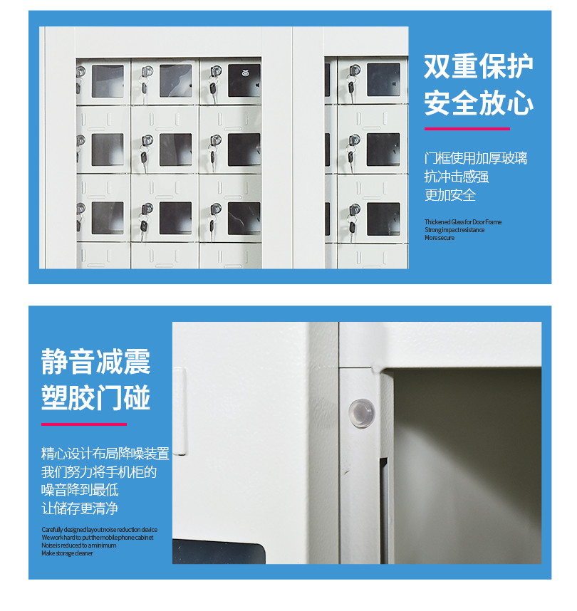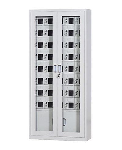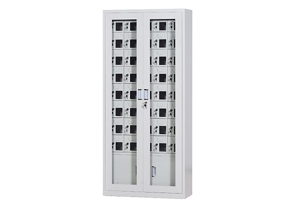 手機保密柜正面為對開金屬邊框玻璃大門,便于觀察柜內(nèi)情況,堅固透亮,美觀大方。